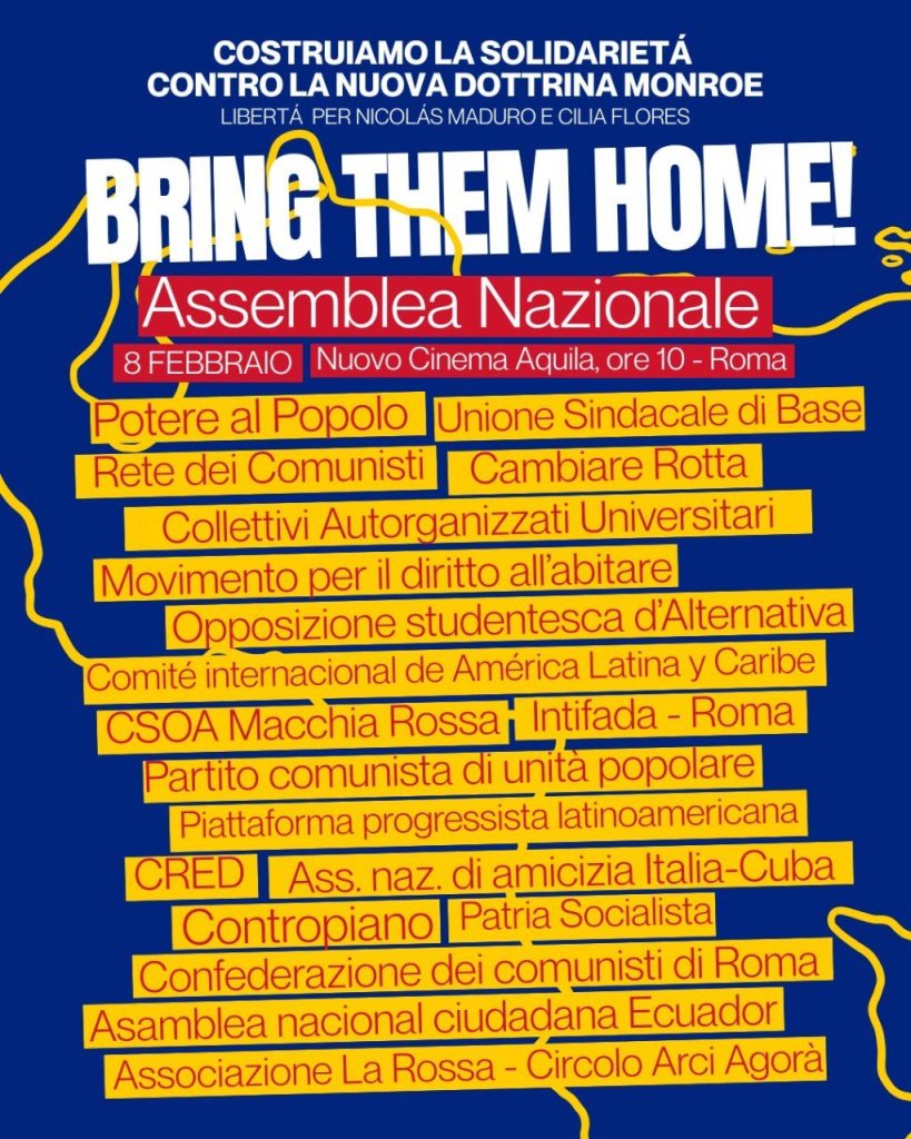 El evento, promovido conjuntamente por USB, Potere al Popolo, el Colectivo Autogestionado Universitario (CAU), la organización estudiantil OSA, la Rete dei Comunisti, Cambiare Rotta, Asociación Italia-Cuba, Cred y otras, congregó a un amplio espectro de fuerzas decididas a exigir la liberación del presidente venezolano Nicolás Maduro y de la primera dama, diputada Cilia Flores.